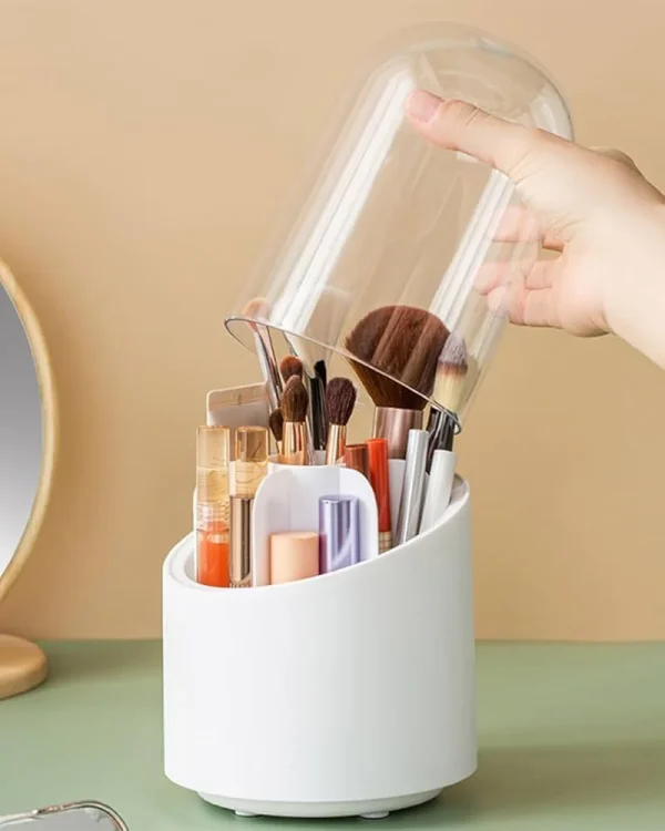 Keep your vanity neat and elegant with the 360° Rotating Makeup Brush Holder. Designed with a dust-proof cover and smooth rotation, it helps you organize brushes, lipsticks, and skincare items efficiently. Its compact yet stylish design adds a touch of sophistication to your dressing table.